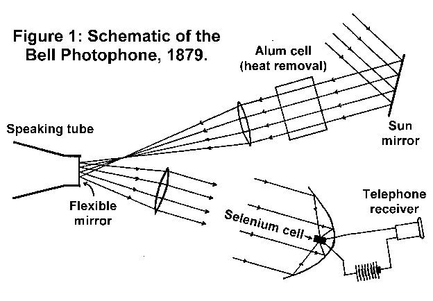 The Bell photophone (Figure 1) used a flexible plane mirror mounted at the end of a speaking tube, so that the sound pressure caused the mirror to change shape, modulating the beam intensity of the reflected light. The receiver was a selenium cell mounted at the focus of a parabolic reflector, and coupled to a battery and telephone receiver. Using this apparatus, Bell transmitted speech over a distance of 213 metres using sunlight, and shorter ranges were covered using various lamps as a light source.