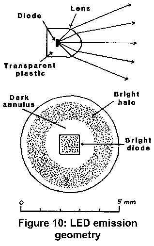 Most light small emitting diodes are supplied in a transparent plastic package with a domed top, which acts as a lens and increases the intensity of the light along the diode axis. The lens does not increase the source luminance, but generates a bright halo as illustrated in Figure 10: