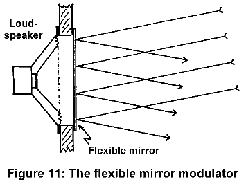 A modern version of the Bell modulator may be constructed by mounting a sheet of aluminised plastic or a thin glass mirror in front of a loudspeaker as shown in Figure 11. There should be a good seal between the loudspeaker rim and the mirror to achieve a tight acoustic coupling.