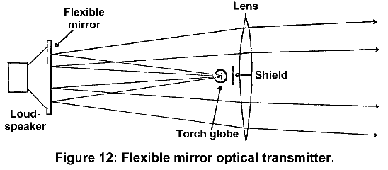 The intensity of a light beam may be modulated by altering the optical flux in the beam with a variable transmission device, or by changing the divergence of the beam. The latter approach was adopted by Bell in his 1880 photophone (Figure 1), which used a flexible mirror to vary the divergence of the reflected beam in sympathy with the sound pressure.