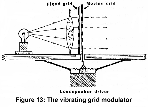 The vibrating grid modulator is constructed from a pair of identical grids, each having equal transparent and opaque strips. One of the grids is fixed, and the other is attached to the voice coil of a loudspeaker driver as shown in Figure 13. The two grids have a static displacement of half a strip width, and driving the voice coil with an audio signal will modulate the transmitted light power about its quiescent value of one quarter of the incident optical flux.