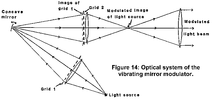 The problems associated with the moving grids were overcome by Rankine in 1915, by using fixed grids and an optical lever as illustrated in Figure 14. The grids were located at the radius of curvature of the concave mirror, which formed an image of the first grid in the plane of the second. A small rotation of the mirror will move this image over the second grid, and modulate the luminance of the image formed by the second lens. The light from this image is collimated by the output lens to produce the main transmitter beam.