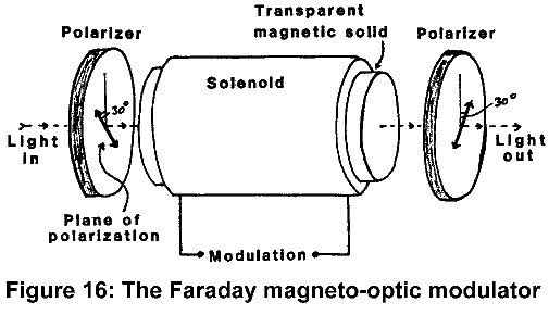 A magneto-optic modulator (Figure 16), utilizes the Faraday rotation of a beam of polarized light shining along a magnetic field. Most transparent materials exhibit a very small Faraday rotation. and the effect is strongest in ferro-magnetic materials. An experimental voice modulator was developed in the 1960's using a thin section of yttrium-iron-garnet. which is transparent to near infra-red and exhibits a large faraday rotation.