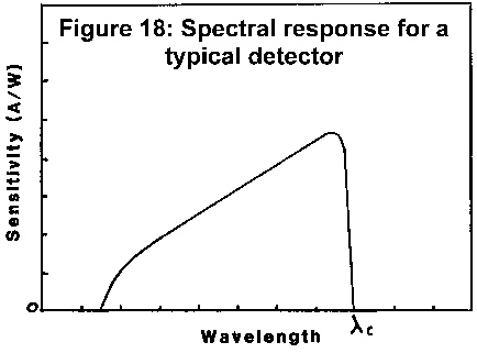 The sensitivity of a photon detector is the detector current generated per watt of incident optical flux. It is inherently wavelength dependent (Figure 18), with the maximum sensitivity at a wavelength slightly shorter than λc. Radiation with a wavelength longer than λc will not be detected. The short wavelength limit is usually determined by absorption in the detector window.