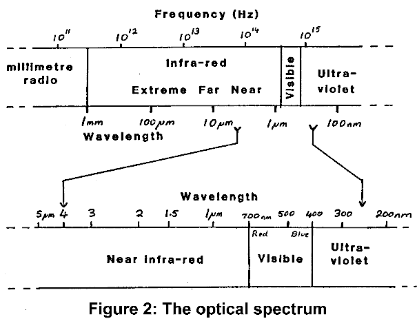 Light may be loosely defined as electromagnetic radiation having a wavelength between 300 nm (3 x 10-7m) and 3µm (3 x 10-6m), which corresponds to a frequency range of 1014 to 1015 Hz. This definition includes visible light with a wavelength between 400 nm and 700 nm, as well as the long wavelength ultra-violet and near infra-red parts of the optical spectrum as shown in Figure 2. Optical communication systems usually operate in the visible or near infra-red.