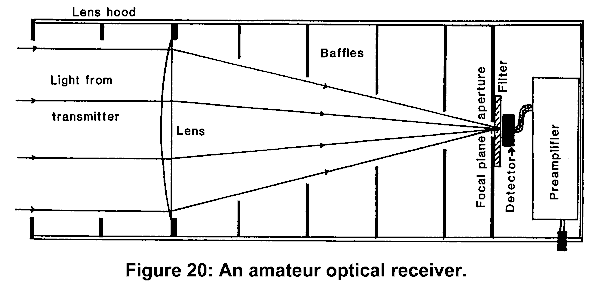 A receiver will detect light arriving within a conical field of view, whose angular diameter is defined by the focal length and detector diameter. This field of view may include unmodulated light from scattered sunlight or moonlight, as well as modulated light from street lighting and other sources. The unmodulated light will generate white noise in the detector, while street lights and house lights will produce a strong 100 Hz interference.