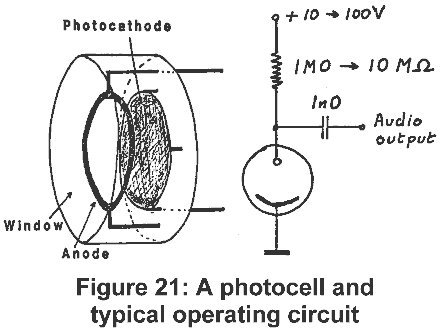 A photocell (Figure 21) is a vacuum diode whose cathode is coated with a material that emits electrons when exposed to light. The spectral response is determined by the cathode coating, which may be a mixture to produce a more constant sensitivity across the visible spectrum. Most photocathodes are relatively insensitive to red and infra-red light, but a photocell with a caesium cathode can detect infra-red wavelengths out to nearly 1300 nm.