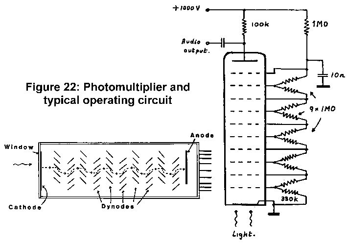 A photomultiplier is a vacuum photocell fitted with a series of dynodes (Figure 22), which multiply the photocurrent by secondary electron emission. A typical photomultiplier has a sensitivity of the order of 105 amps/watt, and can detect a modulated light flux of 10-13W.