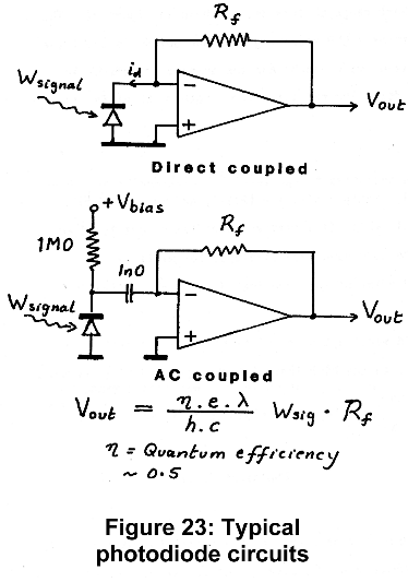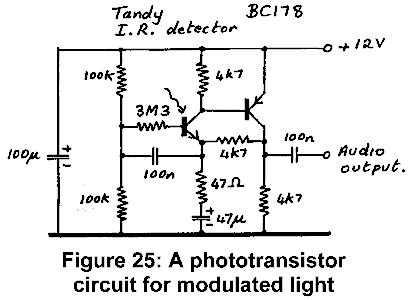 A phototransistor is often operated with an open circuit base for maximum sensitivity, but this produces a high noise level, as the leakage current and background light photocurrent are amplified together with the signal. The dynamic range is limited, and the transistor will saturate at moderate levels of background light. By operating a phototransistor in a bootstrapped amplifier as shown in Figure 25, the quiescent current is stabilized by the DC feedback, while the base impedance is very high at audio frequencies. This circuit is relatively insensitive to background light, but can detect a tone modulated optical flux of 200 pW (2 x 10-10W), and a speech signal of about 1 nW (10-9W).