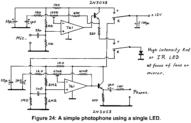 A light emitting diode may be used as both the light source and detector in a short range photophone, as shown in Figure 24. The cutoff wavelength of a LED operating as a photodiode is about the same as the emission wavelength, and the quantum efficiency is rather low when detecting radiation from another LED of the same type: