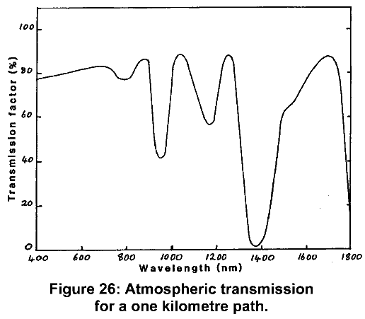 Atmospheric water vapour produces strong absorption bands in the near infra-red, as can be seen in Figure 26, which shows the transmission factor over a 1 km path on a fine autumn or spring day. The infra-red absorption would be lower on a clear frosty night, but more than doubled for a humid summer's day.