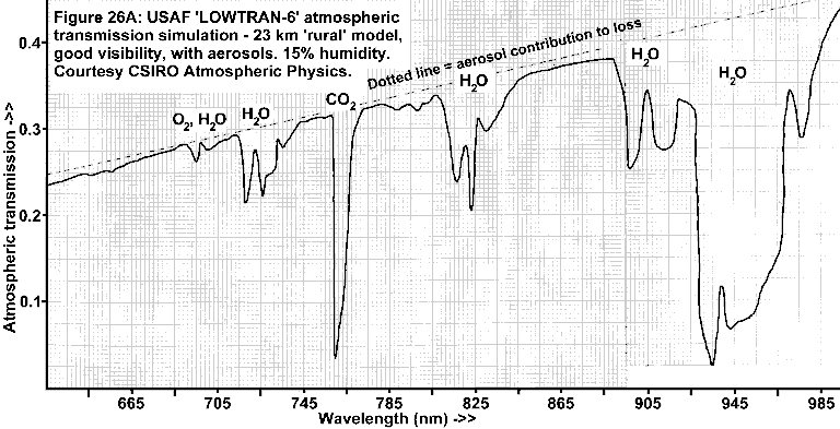 [Note by Chris Long, 8 April 2005: It would be easy to misinterpret the graph above, as the depth of its absorption dips are partly a function of the averaging produced by the graph's poor wavelength resolution. If one narrows the bandwidth of the measuring light source to obtain a higher resolution graph of atmospheric transmission, it would have sharper and more numerous dips in its transmission curve, like the graph below. Figure 26A is based on a computer simulator program developed by the United States Air Force in the early 1980s, into which various figures of distance, humidity etc can be fed to provide a prediction of transmission at various wavelengths for a wide range of conditions. For the graph below, the CSIRO Atmospheric Physics Division in Aspendale (Vic.) was kind enough to feed various atmospheric 'scenarios' into their computer for us, to predict a fair range of possible results under differing weather conditions. The graph below would be typical on a clear, dry day, and has a wavelength resolution similar to that of LED sources: