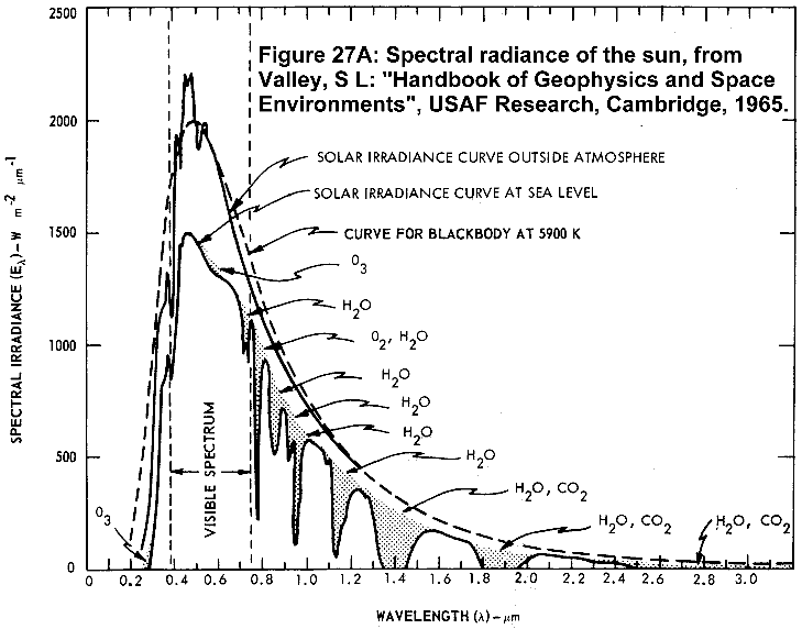 [Note by Chris Long, 7 April 2005: I have added Figure 27A, reproduced immediately above, to give a more detailed view of expected daylight background radiation. During most of the daylight hours, solar radiation at sea level peaks around the wavelength of green light - 500 nm - which, perhaps not surprisingly, roughly matches the peak response wavelength of the human eye. The solar irradiance drops off rapidly at the red end of the spectrum and it falls even further in the near infra-red. Solar background radiation drops to 30% of the green wavelength peak at 1000 nm. The light scattered by the sky falls even more rapidly with increasing wavelength, and the sky appears almost black in infra-red photographs. The amount of undesired daylight background radiation detected by an optical receiver will vary according to the background 'seen' around the transmitter site by the receiver's optical system. Green foliage reflects infra-red light strongly while sky light does not. A simple red Wratten filter (sold by photographic dealers for black and white special effects as the 'red 25' or 'red 25A' filter) placed over the Si PIN diode will therefore help to reduce this daylight background, and a narrow-band filter centred on the transmission wavelength may be even more effective. However, communication systems should avoid the wavelengths shaded on the graph above, which represent atmospheric absorption bands mostly attributable to the spectral lines or resonance bands of H2O, CO2, O2 and 03 (ozone). These obviously reduce the solar irradiation received at ground level on those wavelengths, which might be desirable, but these bands would also absorb a modulated light beam travelling horizontally near sea level to a far greater degree.