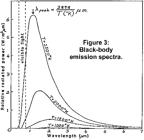 The spectrum of a light source reflects the energy of the excited electrons, and the thermal electrons in a hot body emit broad-band radiation, whose dominant wavelength is a function of the absolute temperature as shown in Figure 3. The 2500°K curve is representative of the spectrum of the white light from a filament lamp or incandescent gas mantle.