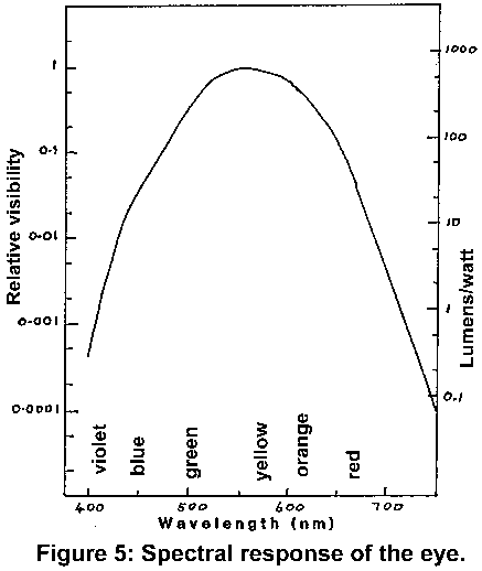 A watt of green light at the wavelength of peak response of the human eye (555 nm), is equivalent to a luminous flux of 692 lumens. The luminous efficiency for light of other wavelengths is reproduced in Figure 5, which may be used to estimate the radiant power from luminous flux measurements.