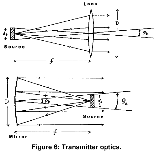 The simplest form of optical transmitter consists of a modulated light source mounted at the focus of a lens or mirror as illustrated in Figure 6. The intensity of the transmitter beam is given by;