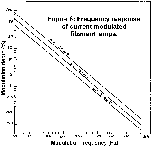 A tungsten filament lamp has a high luminance in the visible and near infra-red (typically 105 W.m-2.sterad-l), but the poor modulation of the light output (Figure 8), reduces the effective modulated luminance to the order of 100 W.m-2.sterad-l.