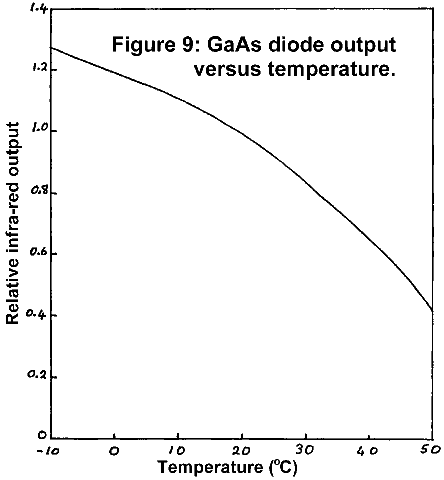 High powered GaAs and GaAlAs infra-red emitting diodes are available with peak output powers of several watts, but the luminance of the source is probably not significantly higher than for smaller diodes. The efficiency and power output of an LED is temperature dependent (Figure 9), and some form of heat sinking is necessary if operating a diode near its maximum current.