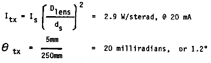A simple photophone transmitter consists of a current modulated Tandy XC880 GaAlAs infra-red diode mounted at the focus of a 100 mm magnifying glass (f = 250 mm). The transmitter beam intensity may be calculated as follows.