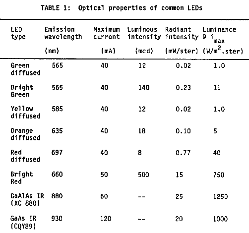 The light emitting diode is the most convenient light source currently available for amateur optical communication. The output is proportional to the forward current and may be modulated to frequencies exceeding 1 MHz. The optical properties of several common light emitting diodes are summarised in Table 1: