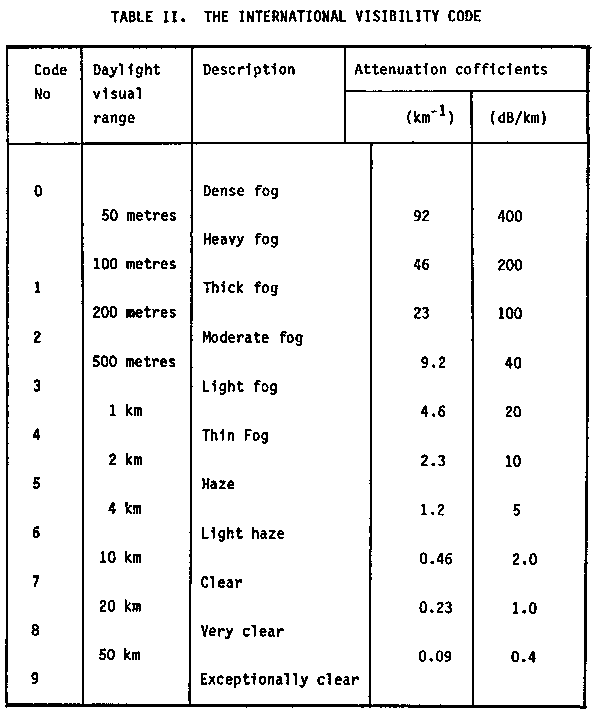Atmospheric absorption from rain, mist, fog, smoke or dust, is the main limitation on the reliable operating range of an optical link, and there is no significant difference in the transmission of infra-red and visible light in fog or rain. It is not possible to predict the signal loss due to adverse weather conditions with any precision, but a rough estimate of the attenuation coefficient may be made from the daylight visual range with the aid of Table 2.