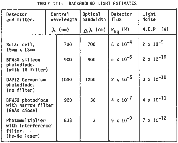 In the middle of a fine sunny day, the background light noise for a BPW50 infra-red photodiode at the focus of a 100 mm lens (f = 250 mm), would be about 2 x 10-10 W (Table 3). In this case, a signal flux of the order of 10-9 W will be required for speech reception. Repeating the previous calculations with Wmin = 10-9 W, will give a vacuum range of 4.3 km, and a clear air daylight range of 3.3 km.