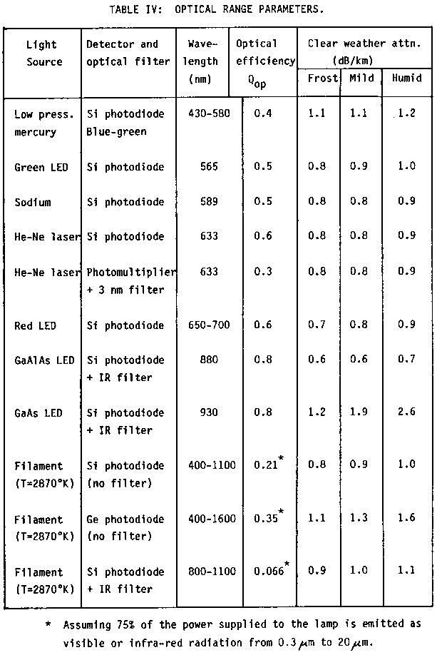 This equation does not have a simple analytic solution for the operating range. but can be solved by successive approximations. From table 4. the clear air transmission loss at a wavelength of 880 nm is 0.8 db/km. which gives an operating range of 7.4 km on a clear night.