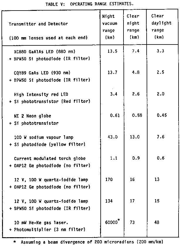 The estimated clear weather operating ranges for various optical communications systems are listed in Table 5, and it can be seen that quite simple equipment can transmit speech or data over distances of 2 or 3 km in clear weather. Over long optical paths, the received signal strength is primarily determined by the atmospheric attenuation, and very intense transmitter beams are required for long distance optical communication.