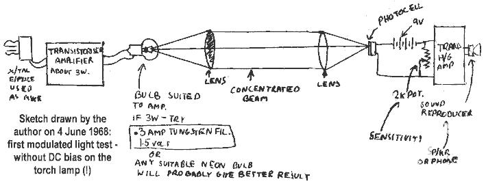 Like many teenagers of the late 1960s, I experimented with modulated light communication using amplifier-driven torch globes or neon lamps for transmitting and CdS photoconductive cells or OCP71 germanium phototransistors for receiving. A page from my bench notebook dated 25 May 1968 - a few weeks after my 14th birthday - shows my earliest plans for an optical system: