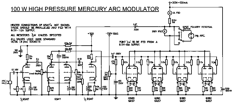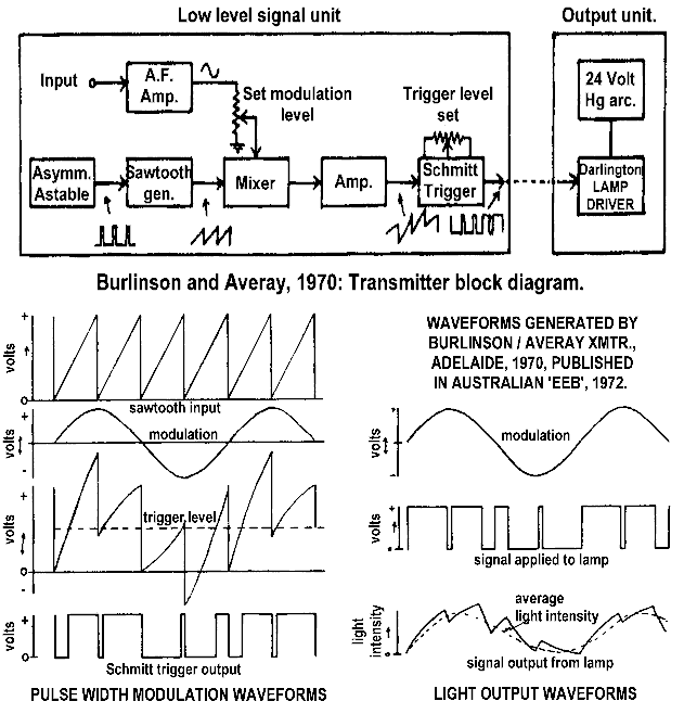 Though their equipment was massively bulky by modern standards, Burlinson and Averay pursued a novel line by driving their gas discharge lamps with audio-modulated 10 KHz pulse width modulation from 'class D' switching output transistors, thereby avoiding linearity and modulation efficiency problems. In this way, the performance was similar to that of the celebrated (at the time) class-D British Sinclair 'X-20' transistorised audio amplifier of the mid-60s. I was not aware of the reports of these tests until the start of 1976, otherwise I may have skipped the next few steps in my own tests...