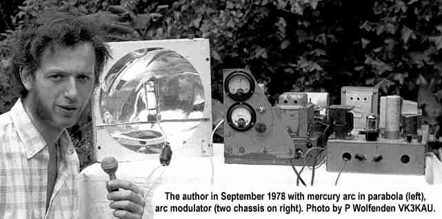 Overall results with this cumbersome link system were remarkably good. Considering the potential theoretical problems of thermal lag and ionisation time, the mercury lamp's limit of 50% modulation at 10 KHz was quite usable, entirely acceptable for direct amplitude modulation at audio frequencies. Piles of signal were available. The output was terrific. At night, with one's eyes dark-adapted, you needed to protect your eyes with dark glasses or welding goggles. But data and narrow band video modulation revealed wild phase shifts above 5KHz. I suspect that the mercury plasma, when thermally modulated at an audio rate, was trying to expand and shrink against its quartz tube housing with each modu1ation cycle, interacting with the arc cavity in a complex series of acoustic resonances. Indeed, one could actually hear the modulation coming from the arc, particularly at high audio frequencies, by putting your ear down near the quartz bulb. One undesirable side effect was that certain modulation frequencies near the arc cavity's acoustic resonance extinguished the discharge. Sibilant sounds were especially risky. In answer to a question about the modulator I remember saying over the link "it's working perfectly!" At the other end, all John heard was "it's working perf - CLICK". The arc extinguished itself, right on cue!