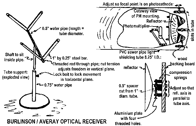 However, I would power up the photomultiplier with a relatively low voltage - about 500 volts - just before sunset, to catch John's first distinct words as the ambient light faded. On hot evenings, the signal was always lower than expected. I couldn't account for this, until one evening I climbed the ladder to adjust the receiver and noticed a strange smell. The receiver's optical cavity was full of smoke! I had forgotten that John was almost directly West of me, and as the summer solstice passed, the position at which the sun set on the horizon was moving North on successive evenings. That night, it was setting directly behind John's house - so my 13 cm receiver lens was focussing the sun's image on the back of the receiver housing, which was made of black-painted particle board. Awk! We were so lucky not to have set fire to everything - but I kept the incident a secret from my folks. Things that my parents didn't know couldn't hurt them! With some embarrassment, I fitted the optics with a removable lens cover.