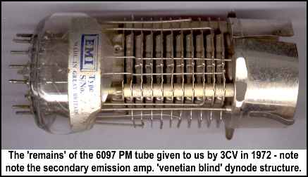 Dan (3UI) and I adapted the EMI 6097 photomultiplier for use in our experimental camera and for the modulated light receivers. Its sensitivity was such an enormous quantum leap from the OCP71 that it opened a whole new world of technical possibilities to us. Further photomultipliers were acquired from the late A H 'Mac' McKibbin, VK3YEO, who used 931A's for slow scan television scanners in those days.