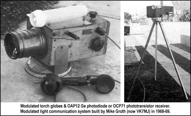 Elsewhere, other Australian experimenters were trying the potential of atmospheric optical communication more seriously. In Adelaide during 1968, my future collaborator Mike Groth (currently VK7MJ, then VK5ZMG) and a lab assistant friend, Stewart Powell, built a pair of optical communication units in the suburb of Hammersmith using torch globes and OAP12 germanium photodiodes. They had a maximum range of about 1 km, and, as Mike puts it, "awful fidelity". Mike's spare time for optical tests was limited at the time by the demands of doing the third year of a BSc - with a new wife.