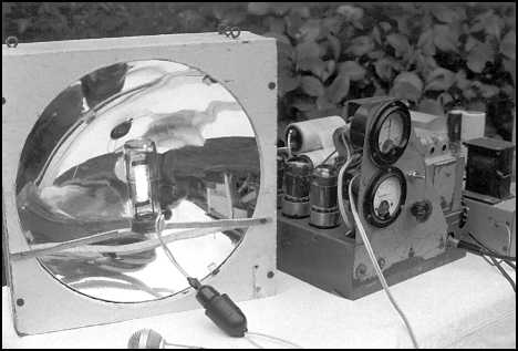 The photographs of the arc system shown here were taken by Peter Wolfenden (VK3KAU) in October 1978. The system is seen essentially as it was in use with VK3ZGJ in 1976. Only the arc lamp had been modified, with its original frosted outer bulb removed (actually smashed carefully with a mallet) and replaced with a clear glass jar. The frosted bulb was unnecessary to the arc's operation, its main purpose being to raise the temperature of the inner quartz discharge tube by insulating it from the outside air. For collimation, a clear-walled glass vessel was desirable, with as little optical diffusion as possible.