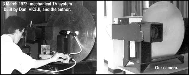 Dan (3UI) and I eventually arranged test transmissions of narrow band television using mechanical disc scanners over his 160 metre transmitter early in 1972. The next couple of years gave all of us a good grounding in the principles of light detection and modulation, video amplification and optics.