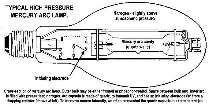 Another unexpected fault took ages to detect. After a seemingly harmless rainstorm, the mercury lamps would cease to function. The lamp itself seemed perfectly OK, even on close examination. We finally found that water had drained down the bulb into to lamp's Edison screw socket. There, the DC bias set up an electroplating action, dissolving the wires connecting the base with the bulb. The problem was quite simply solved by mounting the lamps upside-down.