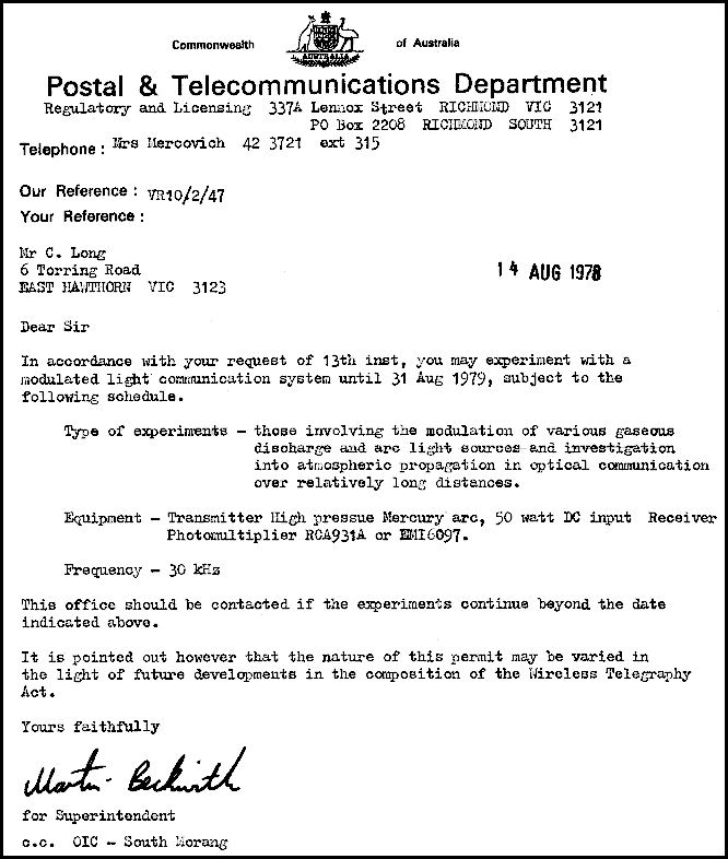 To be reasonably sure of my legal status in the context of publication, I applied for a permit to use the arc communication system from the Postal and Telecommunication Department's Regulatory and Licensing Section in 1978. Their eventual reply is reproduced below, and was received a few weeks after the submission of my manuscript on the subject to Bruce Bathols, the editor of 'Amateur Radio' magazine: