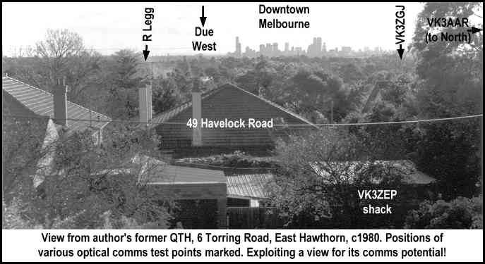 At my home, I was fortunate in having an elevated position near the top of a hill in East Hawthorn, South of Camberwell Junction and quite close to the high copper dome of 'Our Lady Of Victories' catholic church. Standing on our roof, the view of downtown Melbourne to the West and of the suburbs around to the North was unobstructed, encompassing all of Hawthorn, Kew, Toorak, Kooyong as well as parts of Malvern, Richmond, Abbotsford and Northcote in an unbroken 120 degree arc. Just on my side of the Yarra, on the top of a rise in clear view, was VK3ZGJ, with his shack facing me at the third floor rear of an old Victorian mansion at 29 Shakespeare Grove, West Hawthorn. The topography was ideal for optical communication tests, exactly two miles (about 3.5 km) on an East-West path.