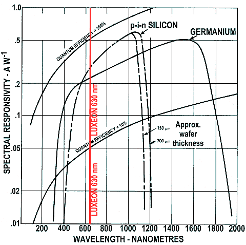 Of the available Luxeon emission colours shown above, the red, red/orange and amber emitters have the advantage of being based on the AlInGaP chip, which can be driven to a much higher current density than the Nitride chips which generate the shorter wavelengths. The blue-cyan-green-white Nitride chip can only reach 50 amps/cm2, while the red-orange-amber AlInGaP chip can be driven at 140 amps/cm2. Red Luxeons also provide the best spectral match for silicon photodiodes, as the response graphs below indicate: