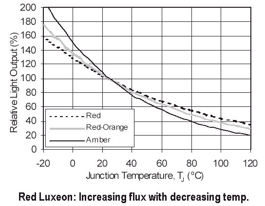 A device with the red Luxeon III's power rating naturally produces some loss via heat. The importance of dissipating that heat is shown by the graph below. The light flux output of the red Luxeon III is inversely related to the temperature at which it operates. The larger the heatsink on the Luxeon III, the greater its light output can be: