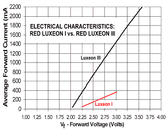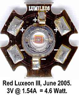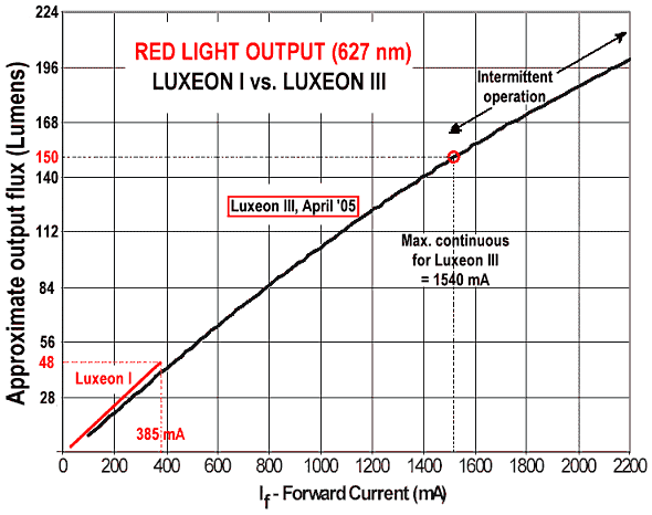In a source area of less than 1mm2, the red 1 Watt Luxeon of 2002 could generate about 35 Lumens of output at a 2.95 volt, 385 mA input. Since then, the output of 1 watt red Luxeons has been improved to around 50 lumens for the same power input.