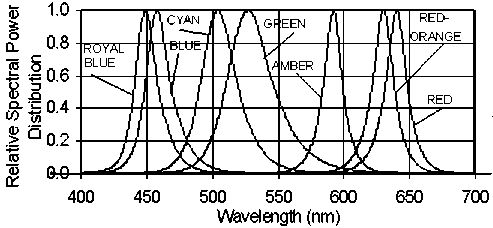 Lumileds' effort has principally been directed to making an efficient white illumination source to compete with incandescents. For this, they use a blue-emitting InGaN chip is with a yellow phosphor coating. Naturally, the response of a phosphor-based light is much slower than the chip's direct emission, so these are unsuited to communications. The short wavelength blue-white radiation also doesn't match the spectral response of silicon photodetectors. The full range of Luxeon colours available is shown below: