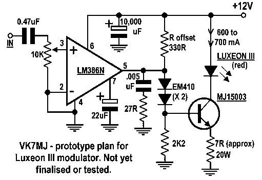 We should emphasise that the circuit diagrams above are only suggestions for prototyping, and haven't yet been tested. Our present modulators are set up for the Luxeon I, which needs a standing current of only 190 mA. To produce the Luxeon III's requisite quiescent current of about 700 mA, the voltages around the output transistor would probably have to be manipulated and changed from the values shown. These are 'ball park' component values, for experimental circuit development only.