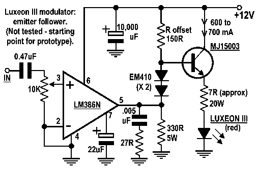 Alternatively, the output transistor could run in emitter follower configuration with the Luxeon III and limiting resistor between emitter and earth. With a 12 volt rail, if the output transistor had a typical beta of 20, and the Luxeon was passing 700 mA, the base would have to bleed about 700 ÷ 20 = 35 mA, and a 700 mW driving signal should be more than adequate. This audio drive could be inexpensively provided with a minimum component count by an LM386N IC (commonly available in Australia).