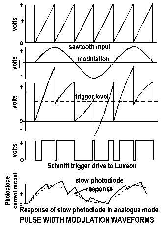 A suggestion made by Burlinson and Averay in the Australian 'EEB' magazine circa 1970 was to use pulse width modulation for modulated light transmitting. A sawtooth waveform may be added to an audio waveform, then applied to a Schmitt trigger to produce audio-modulated PWM, as shown in the diagram below.