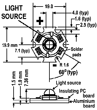 While the 'lambertian' radiation pattern suits our purposes perfectly, our readers should be made aware that Luxeons can also be supplied with 'batwing' or 'side-emitting' polar patterns. These are unsuited to collimation and should be avoided for communication purposes.