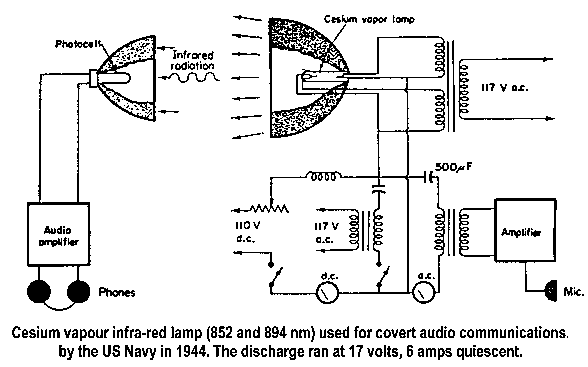 A more wholly electronic approach was taken by the United States Navy, which used modulated Cesium vapour lamps to communicate at infra-red wavelengths (see diagram below):