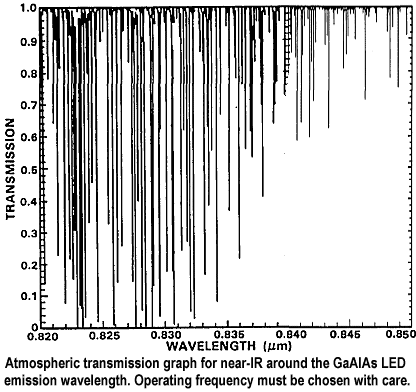 [Note by author, May 2005: the graph above was produced with the HITRAN (high resolution atmospheric transmission) software developed in the 1980s at the US Air Force Geophysical Laboratory. A 0.83 µm GaAlAs IR LED would emit over approximately a .02 µm wide band, spanning many of the absorption lines between 0.81 and 0.85 µm. Judging from this graph, atmospheric transmission would tend to be better at the long wavelength end of the GaAlAs LED output band, around 0.845 µm. A laser source for atmospheric communication, having a much narrower bandwidth, would need to have its wavelength chosen with much greater care!]