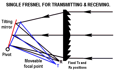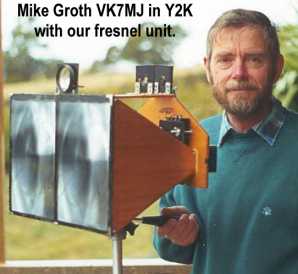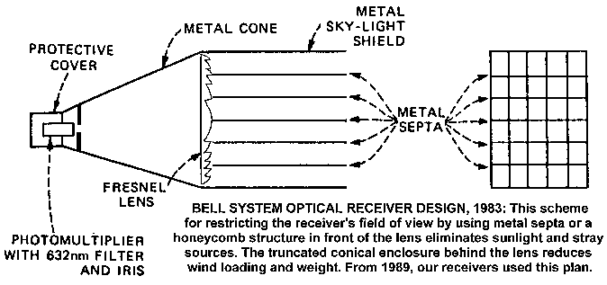 Magnifying glasses of five inch diameter were used for the photomultiplier receivers in 1976. The cost of these glass lenses have risen beyond $50 in the past fifteen years. A much more viable option lies in the usage of the plastic fresnel lens. These are sheets of plastic with concentric grooves moulded on them, like an l.p. record. Each groove is a tiny refracting facet comprising an annulus section of a convex lens surface. Thus a large diameter, lightweight and inexpensive lens with remarkably short focal length is achieved. Fresnels are commonly used as condensing lenses in overhead projectors, and as "magnifying sheet" reading aids. In Australia, 10 by 8 inch magnifying sheets are available for about Aus.$12, and from a Taiwanese source (3DLens Company), a 16 inch square lens is available for US$28.50. The latter has over 16 times the collection area of our old 5" glass lenses, yet can be bought for half the price!